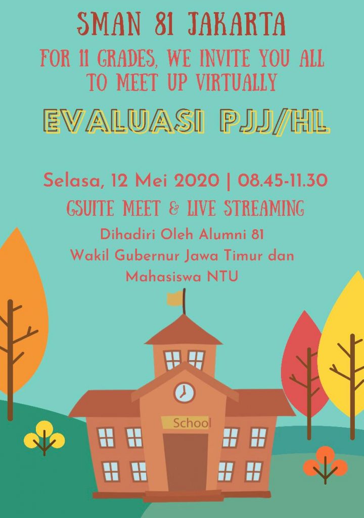 PIhak Manajemen SMAN 81 Jakarta, pada tanggal 12 Mei 2020 telah menyelenggarakan kegiatan Evaluasi Pembelajaran Jarak Jauh ( PJJ ) secara video conference Google meet untuk siswa kelas XI tahun Pelajaran 2019-2020 yang dihadiri oleh semua Guru dan karyawan SMAN 81, Para orang tua & siswa kelas XI serta pembicara nara sumber dari Alumni SMAN 81 Jakarta yang sedang kuliah di Singapura dan Sensei guru bahasa Jepang yang ada di Vietnam, Kasudin pendidikan Jakarta Timur wilayah II serta Wakil Gubernur Jawa Timur yang pernah belajar di SMAN 81 Jakarta.